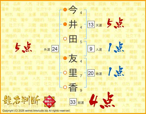 今(4画)井(4画)田(5画) 友(4画)里(7画)香(9画)