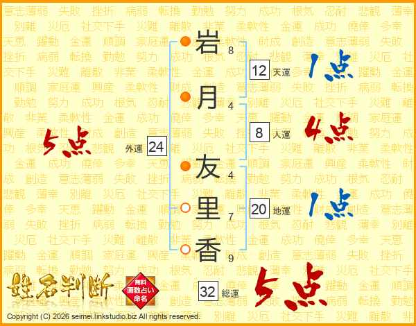 岩(8画)月(4画) 友(4画)里(7画)香(9画)