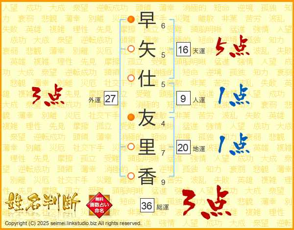 早(6画)矢(5画)仕(5画) 友(4画)里(7画)香(9画)