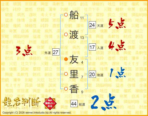 船(11画)渡(13画) 友(4画)里(7画)香(9画)