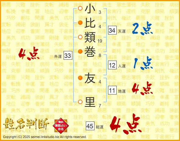 小(3画)比(4画)類(19画)巻(8画) 友(4画)里(7画)