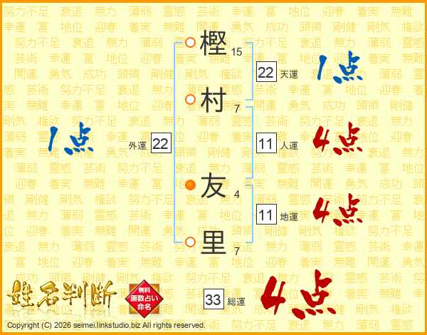 樫(15画)村(7画) 友(4画)里(7画)