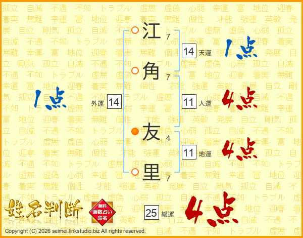生活面を象徴する運勢です。外部から受ける影響力を表し、結婚運、家庭運や職場、環境への順応性を表します。総運から人運を引いた画数。姓や名が1文字の場合を除く。
