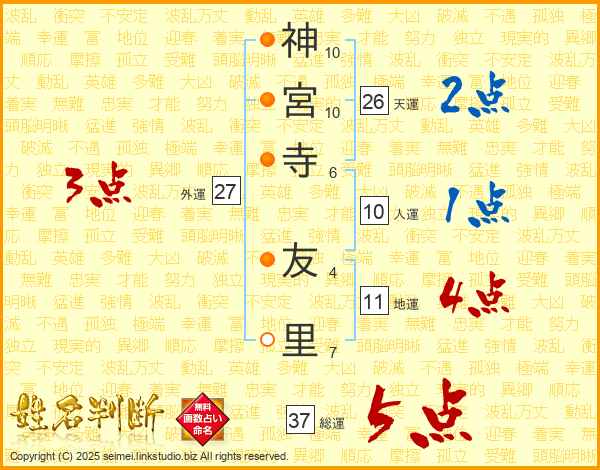 神(10画)宮(10画)寺(6画) 友(4画)里(7画)