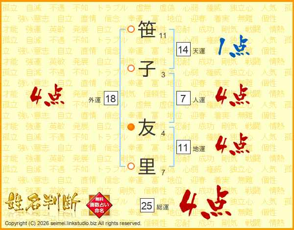 笹(11画)子(3画) 友(4画)里(7画)