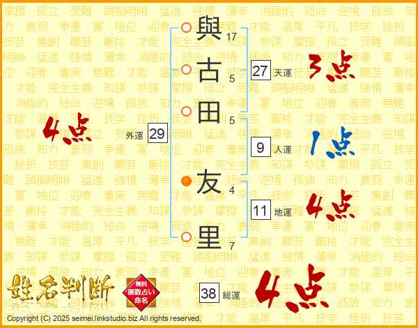 與(17画)古(5画)田(5画)  友(4画)里(7画)