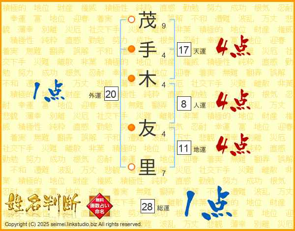 茂(9画)手(4画)木(4画) 友(4画)里(7画)