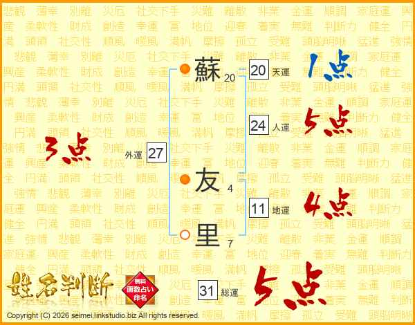 生活面を象徴する運勢です。外部から受ける影響力を表し、結婚運、家庭運や職場、環境への順応性を表します。総運から人運を引いた画数。姓や名が1文字の場合を除く。