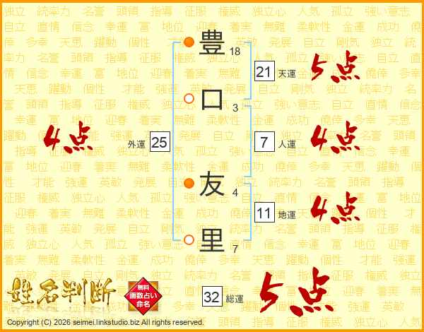 生活面を象徴する運勢です。外部から受ける影響力を表し、結婚運、家庭運や職場、環境への順応性を表します。総運から人運を引いた画数。姓や名が1文字の場合を除く。