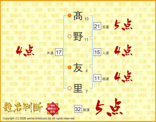 髙(10画)野(11画) 友(4画)里(7画)