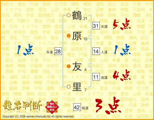 鶴(21画)原(10画) 友(4画)里(7画)