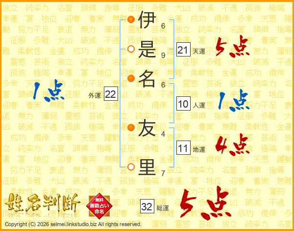 伊是名友里さんの総運は32画の5点!