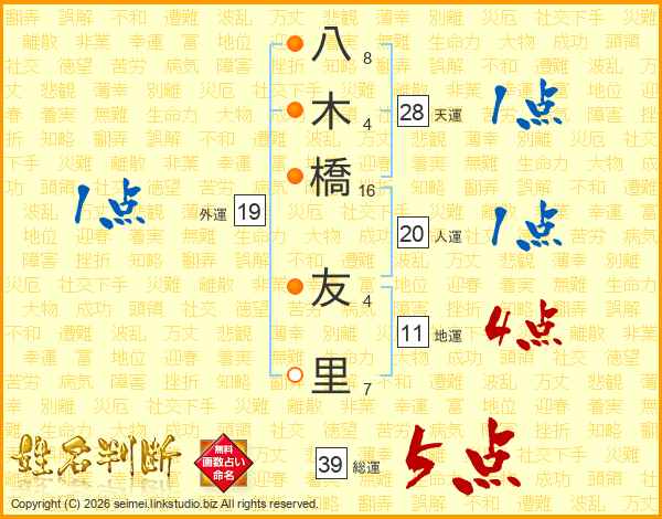 八木橋友里さんの総運は39画の5点!
