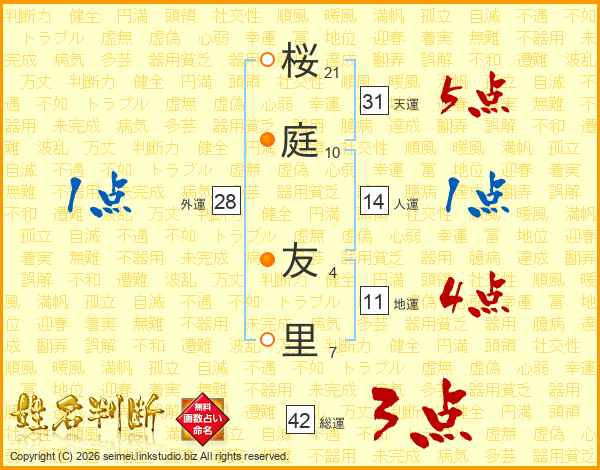 桜(21画)庭(10画) 友(4画)里(7画)