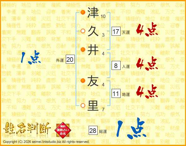 津(10画)久(3画)井(4画) 友(4画)里(7画)