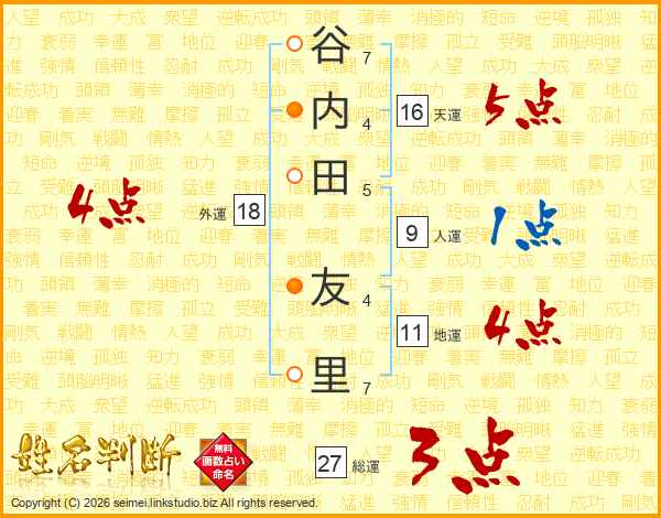 谷(7画)内(4画)田(5画) 友(4画)里(7画)