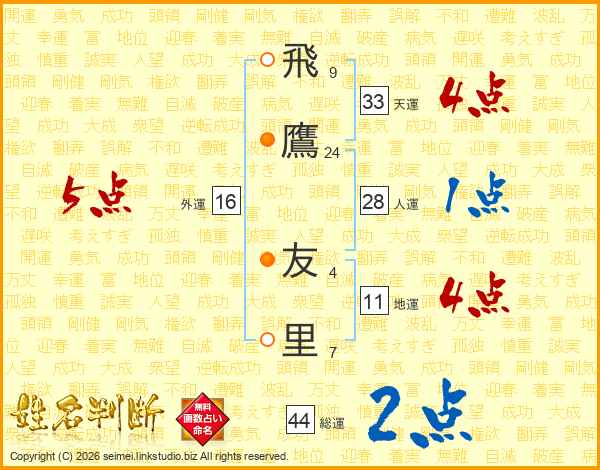 飛(9画)鷹(24画) 友(4画)里(7画)
