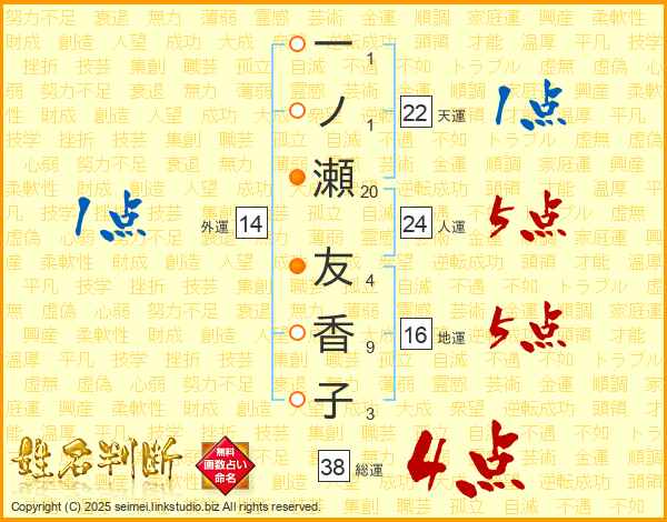 一(1画)ノ(1画)瀬(20画) 友(4画)香(9画)子(3画)