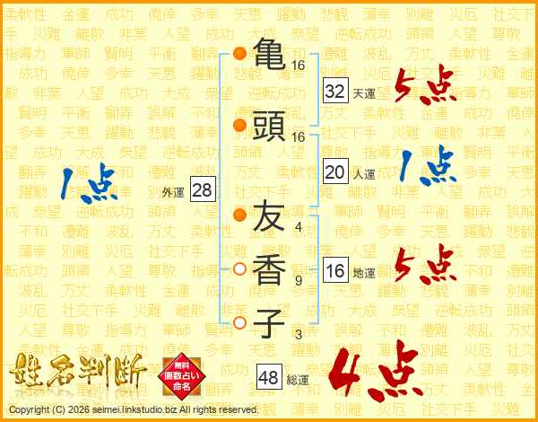 亀(16画)頭(16画) 友(4画)香(9画)子(3画)