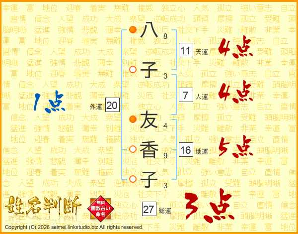 八(8画)子(3画) 友(4画)香(9画)子(3画)