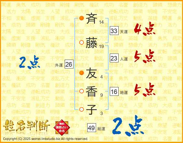 斉(14画)藤(19画) 友(4画)香(9画)子(3画)