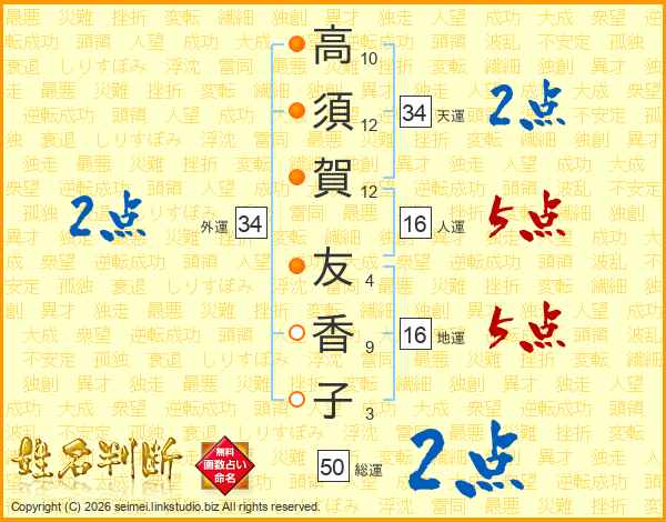 高(10画)須(12画)賀(12画) 友(4画)香(9画)子(3画)