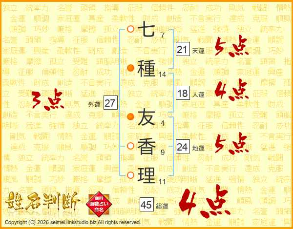 七種友香理さんの総運は45画の4点!