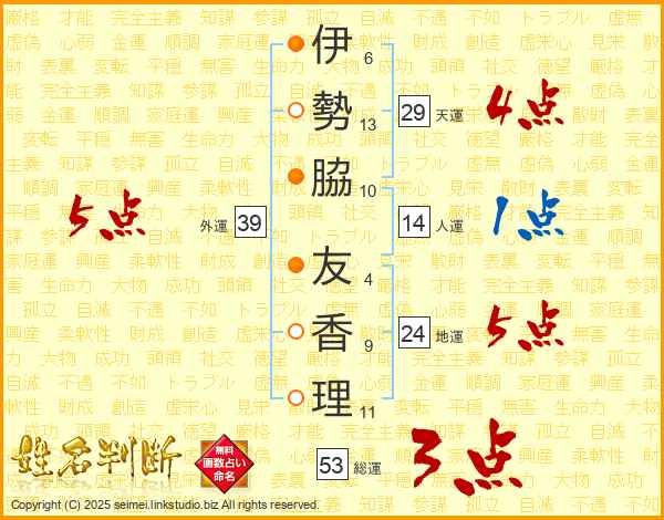 伊(6画)勢(13画)脇(10画) 友(4画)香(9画)理(11画)