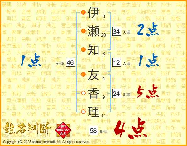 伊(6画)瀬(20画)知(8画) 友(4画)香(9画)理(11画)
