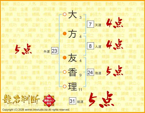 大(3画)方(4画) 友(4画)香(9画)理(11画)
