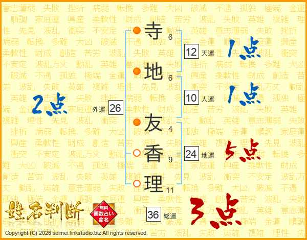 寺(6画)地(6画) 友(4画)香(9画)理(11画)