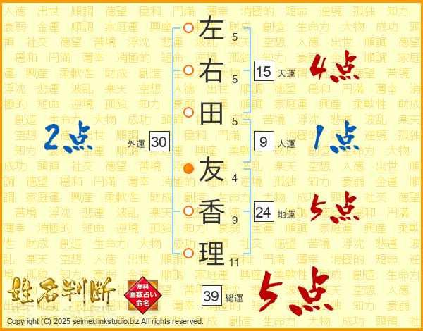 左(5画)右(5画)田(5画) 友(4画)香(9画)理(11画)