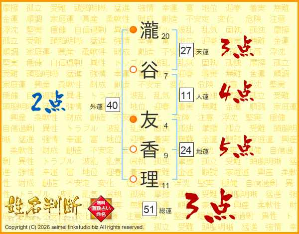 瀧(20画)谷(7画) 友(4画)香(9画)理(11画)