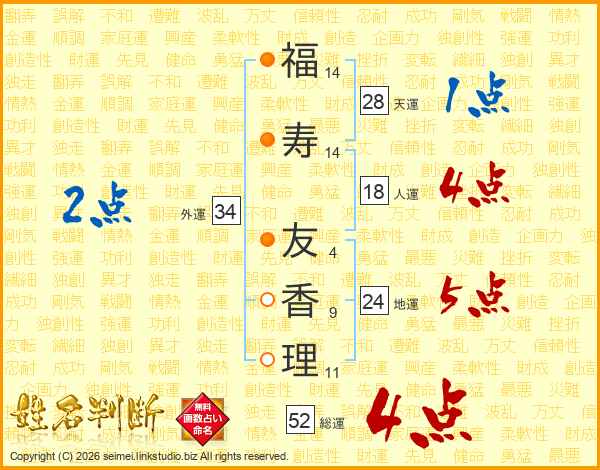 福(14画)寿(14画) 友(4画)香(9画)理(11画)