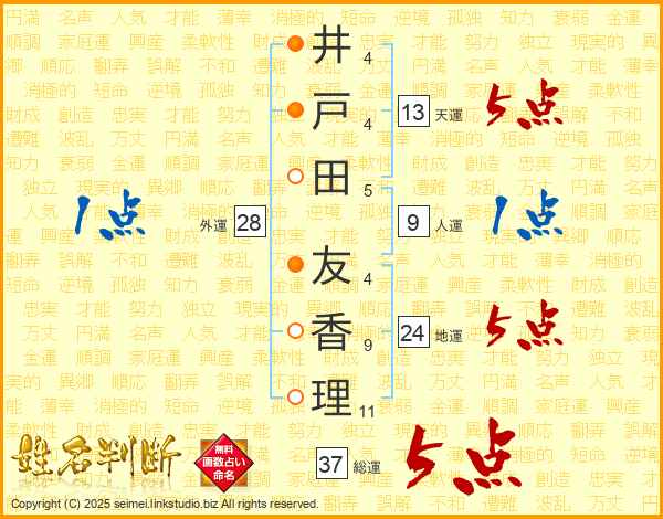 井(4画)戸(4画)田(5画) 友(4画)香(9画)理(11画)