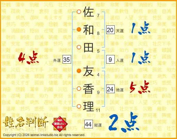 佐(7画)和(8画)田(5画) 友(4画)香(9画)理(11画)