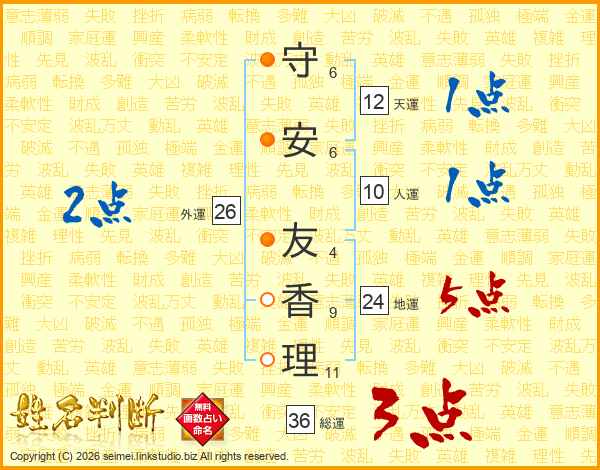 守(6画)安(6画) 友(4画)香(9画)理(11画)