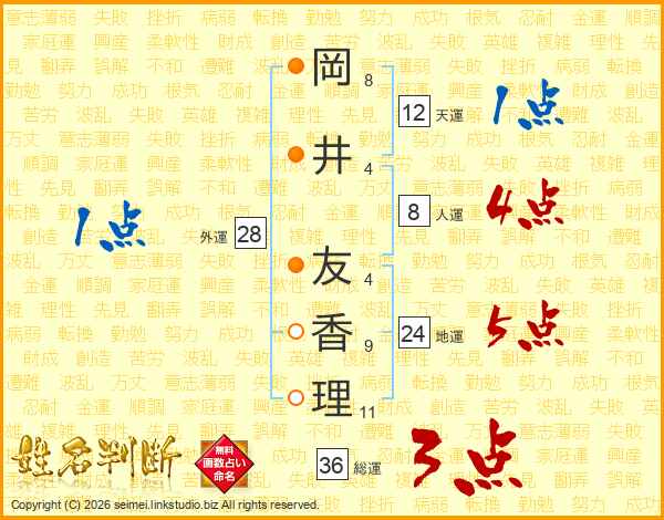 岡(8画)井(4画) 友(4画)香(9画)理(11画)