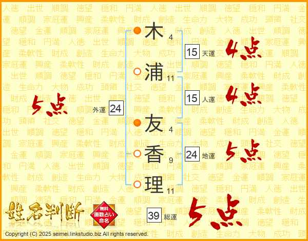 木(4画)浦(11画) 友(4画)香(9画)理(11画)