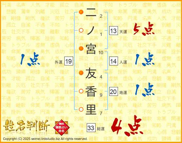 二(2画)ノ(1画)宮(10画) 友(4画)香(9画)里(7画)