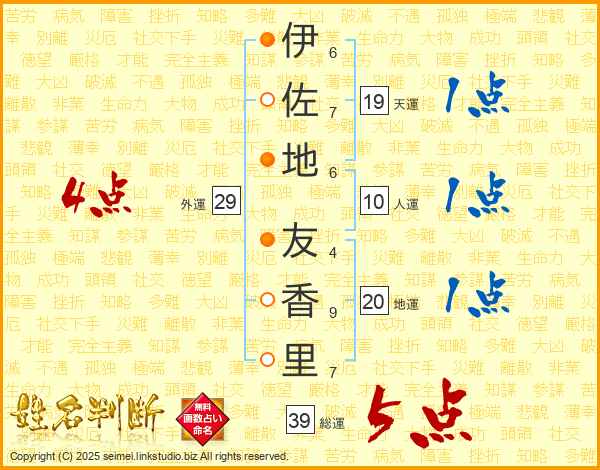 伊(6画)佐(7画)地(6画) 友(4画)香(9画)里(7画)