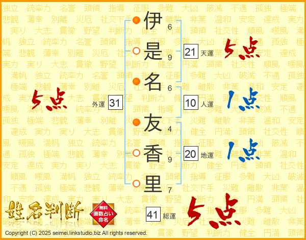 伊(6画)是(9画)名(6画) 友(4画)香(9画)里(7画)