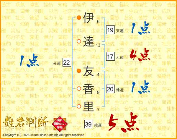 伊(6画)達(13画) 友(4画)香(9画)里(7画)