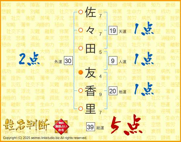 佐々田友香里さんの総運は39画の5点!