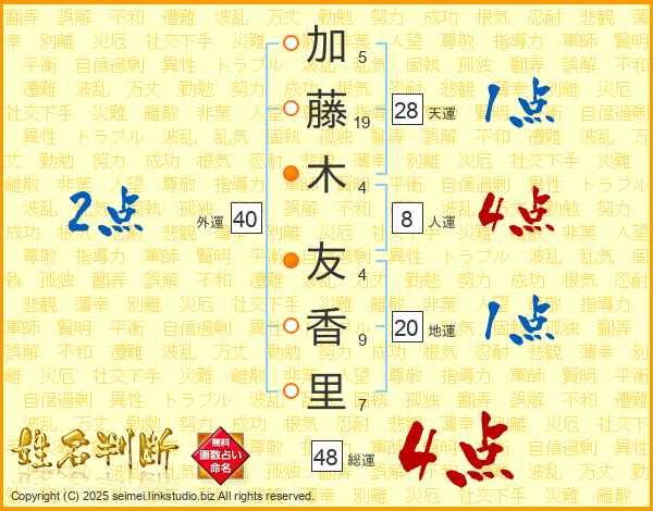 加(5画)藤(19画)木(4画) 友(4画)香(9画)里(7画)