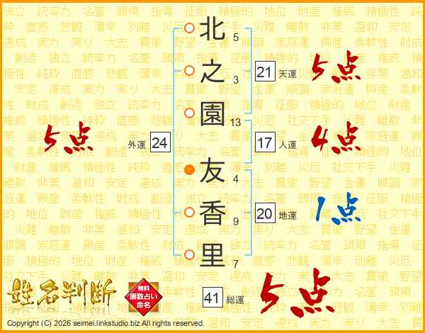 北(5画)之(3画)園(13画) 友(4画)香(9画)里(7画)