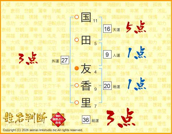 国(11画)田(5画) 友(4画)香(9画)里(7画)
