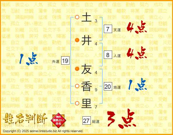 土(3画)井(4画) 友(4画)香(9画)里(7画)