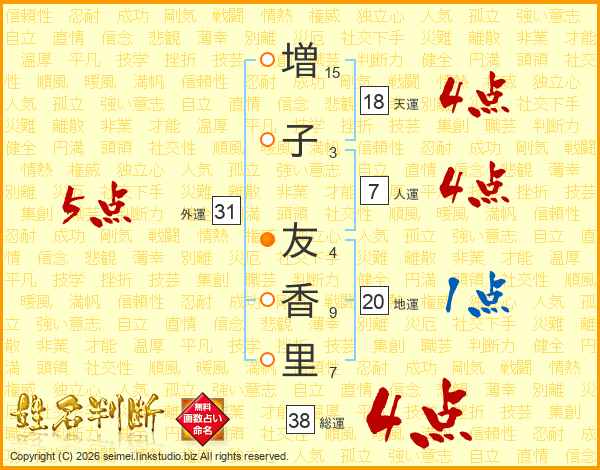 増(15画)子(3画) 友(4画)香(9画)里(7画)
