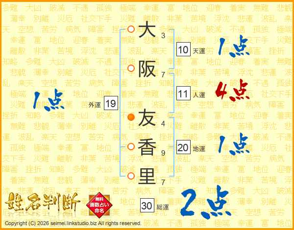 大阪友香里さんの人運は11画の4点!
